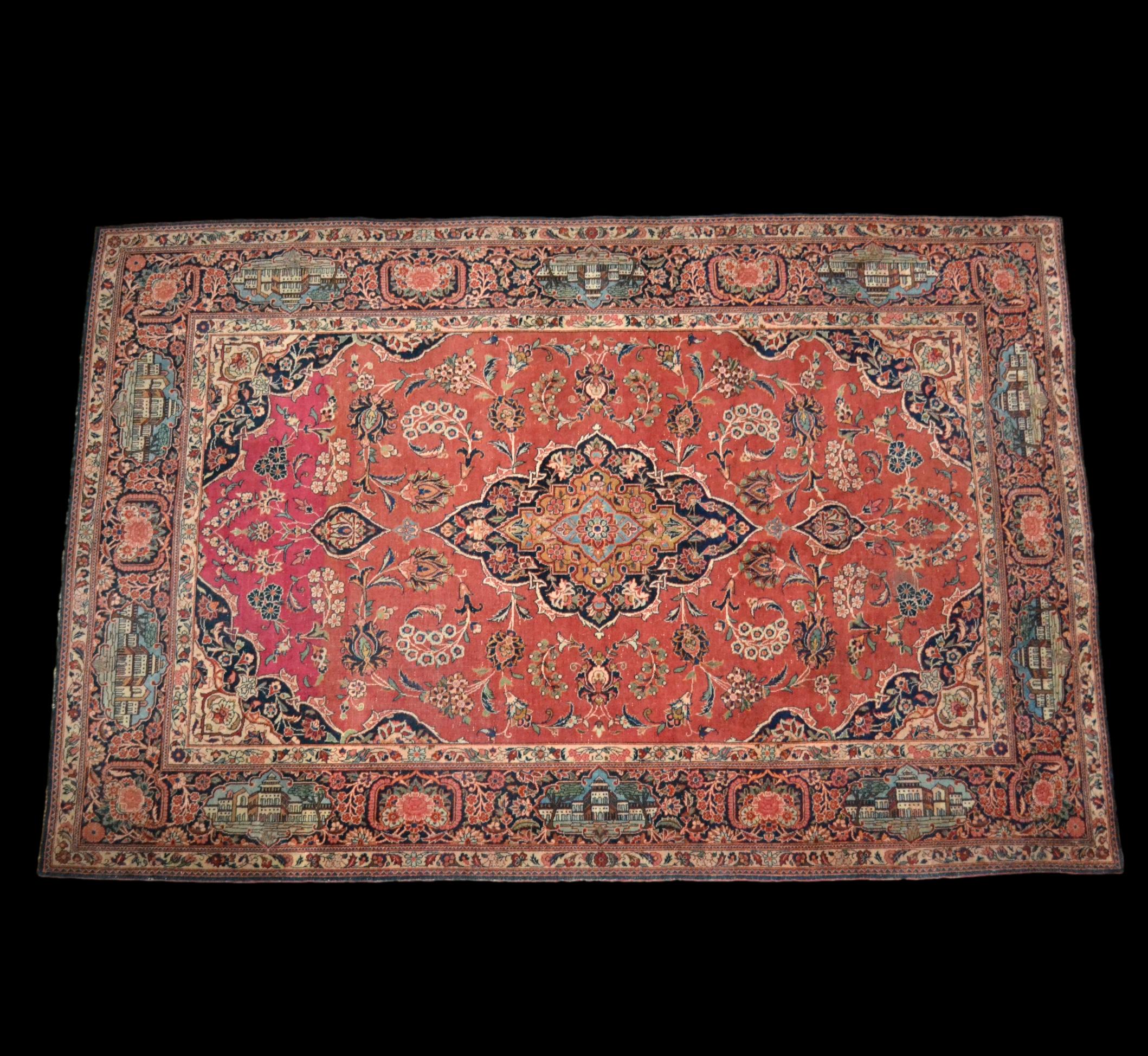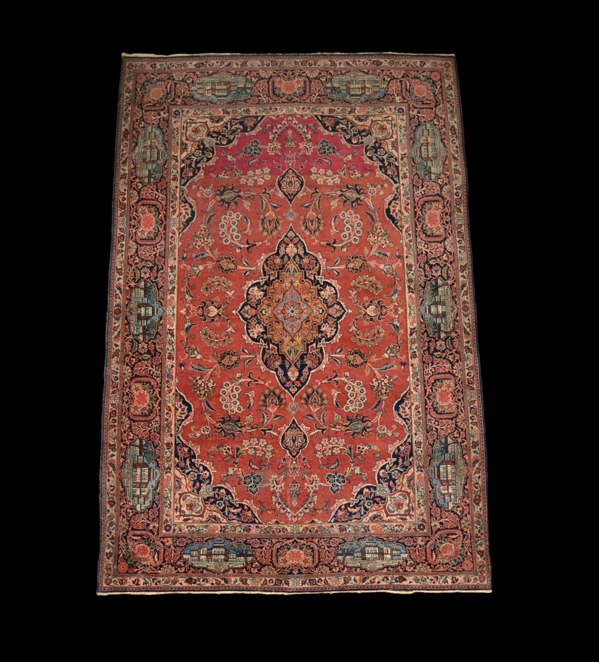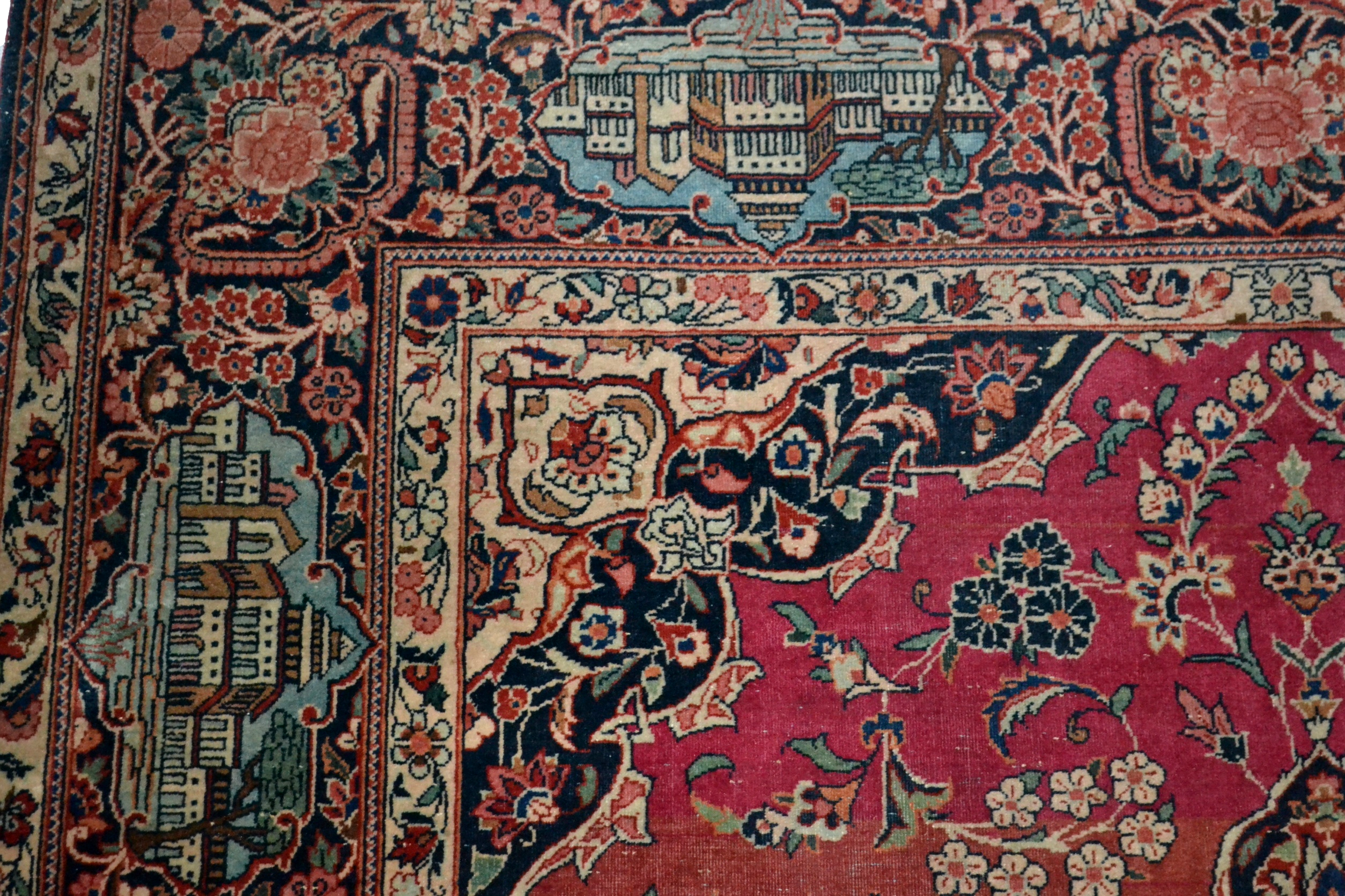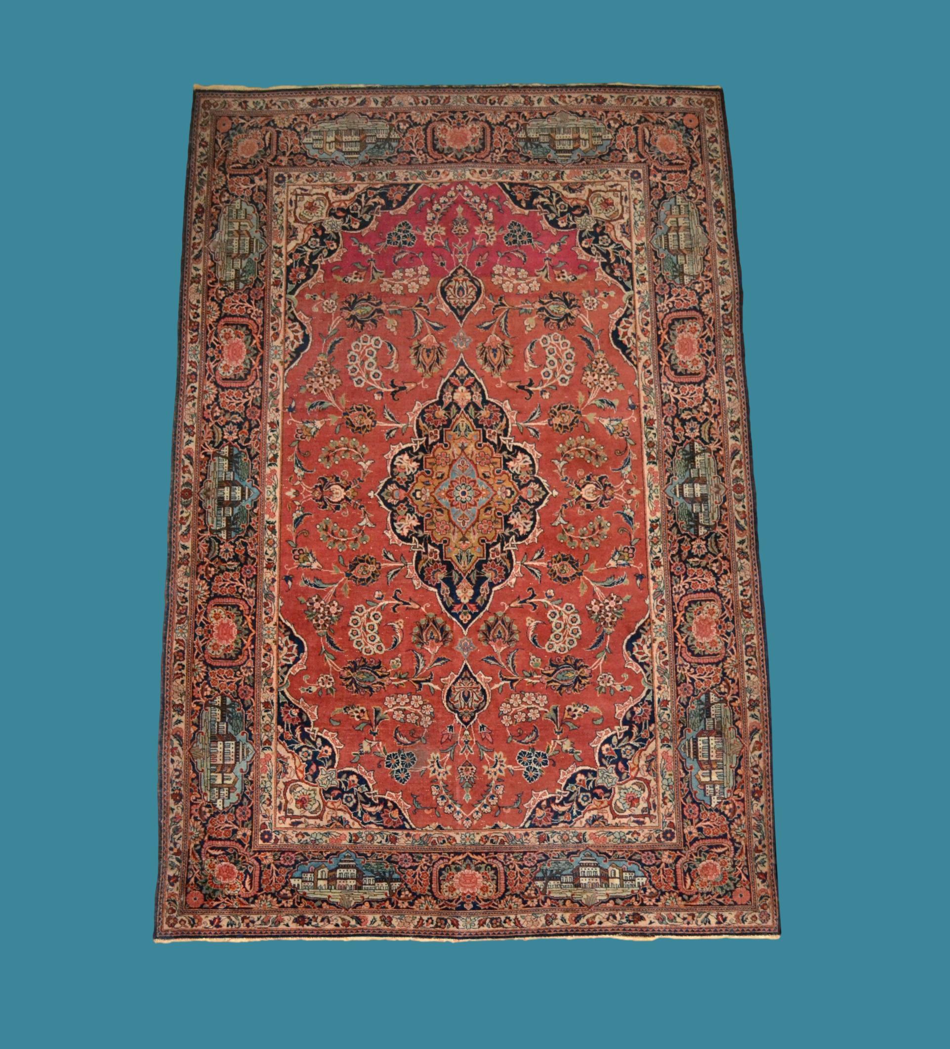 Rare Kashan ancien de collection, noué main en laine et soie du milieu du XIXème siècle, ère Kadjar, à décor d’architectures et fleurs, toisant 136 cm de large par 208 cm de longueur .