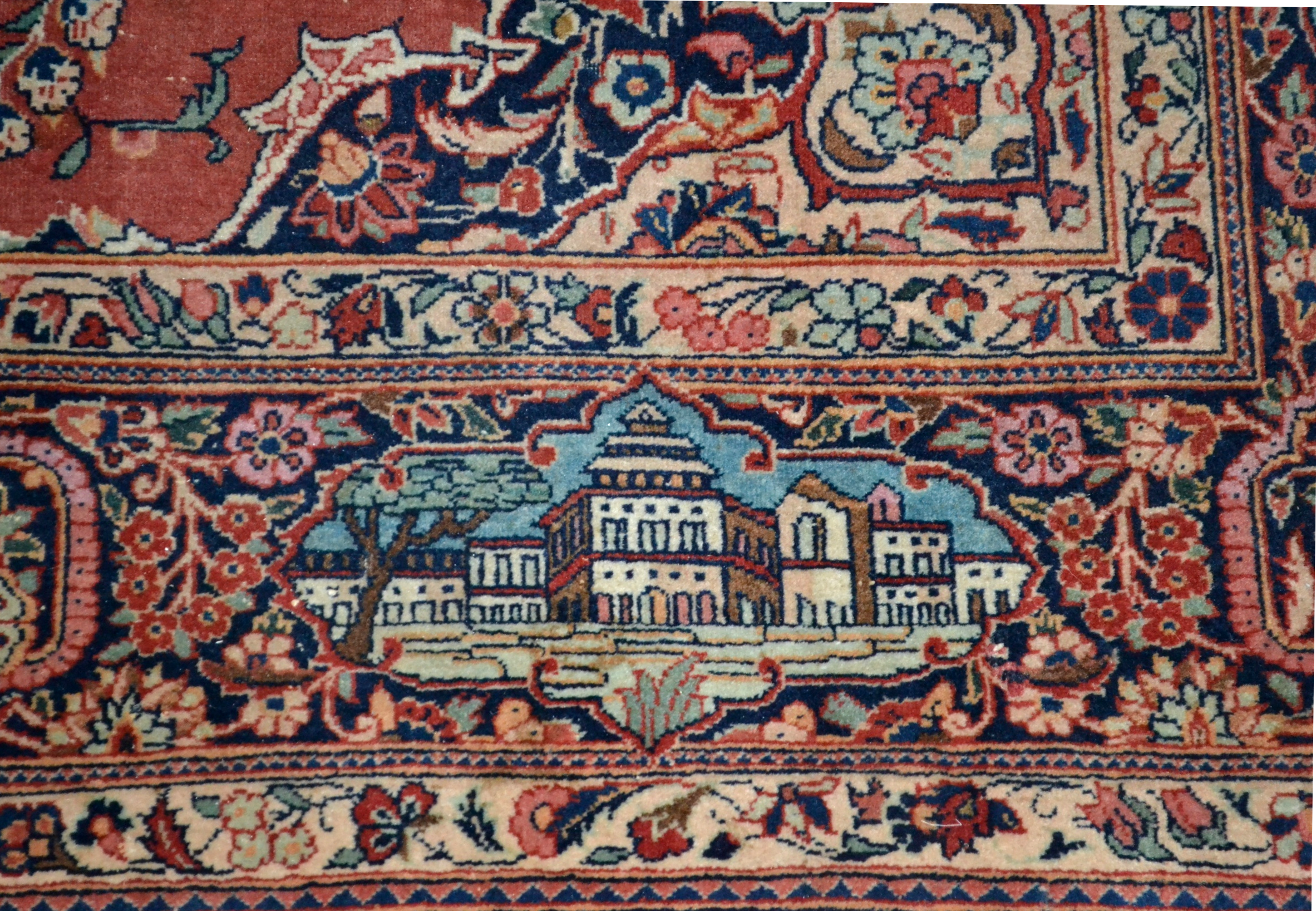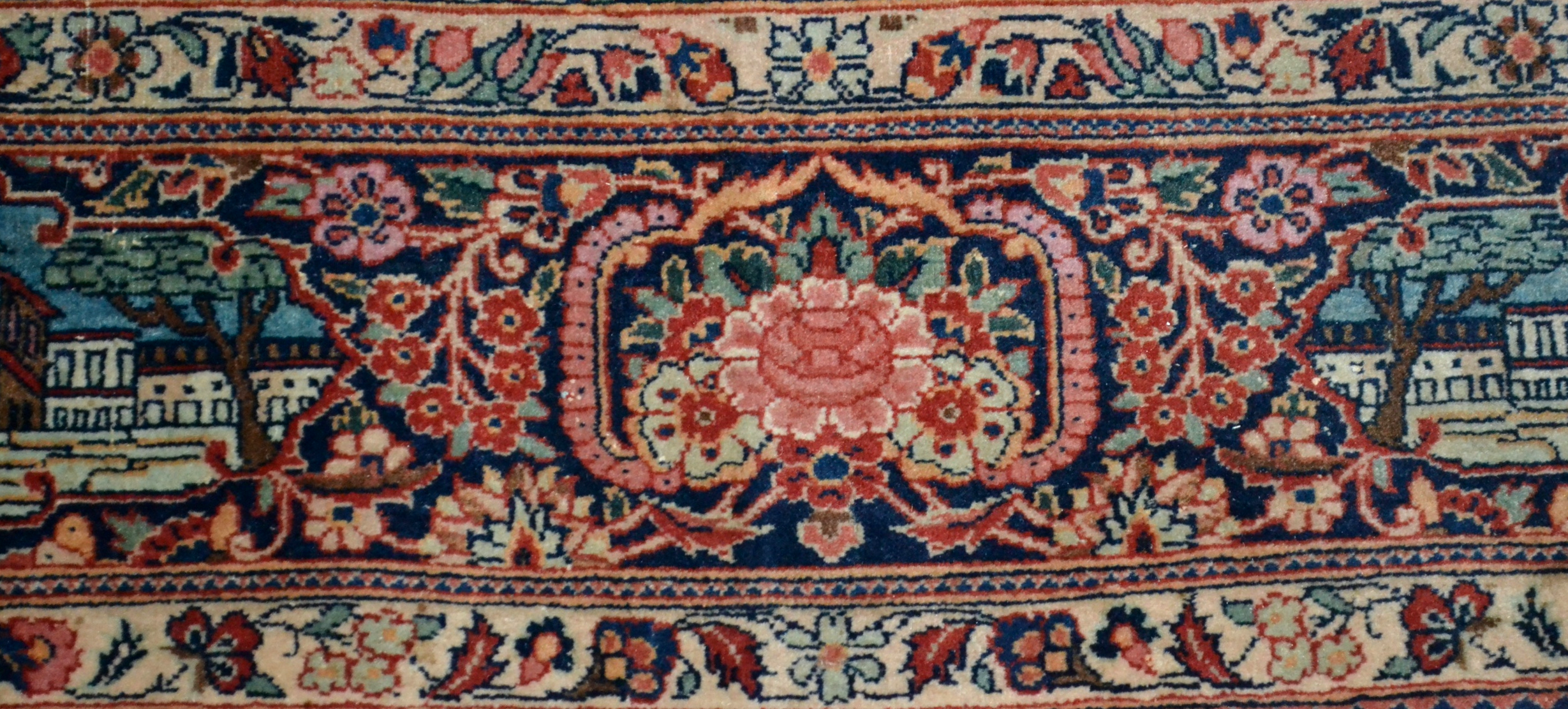 La bordure, bande principale composée de cartouches alternant bouquets d’une rose et pivoines avec des décors de palais.