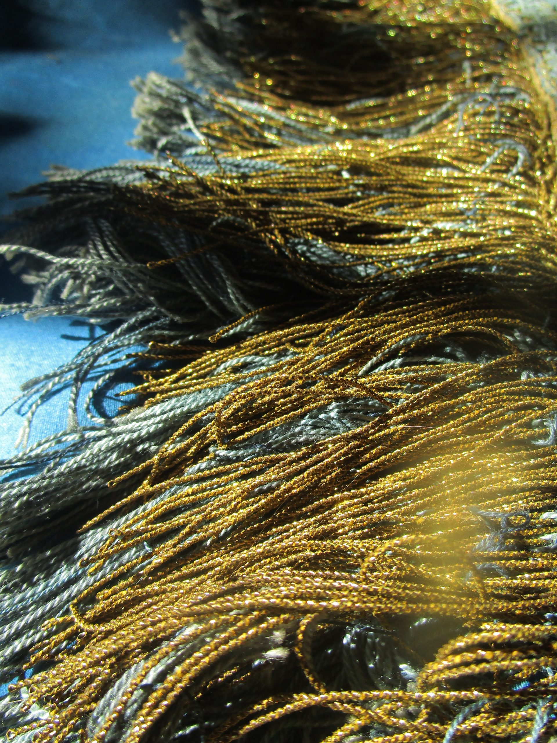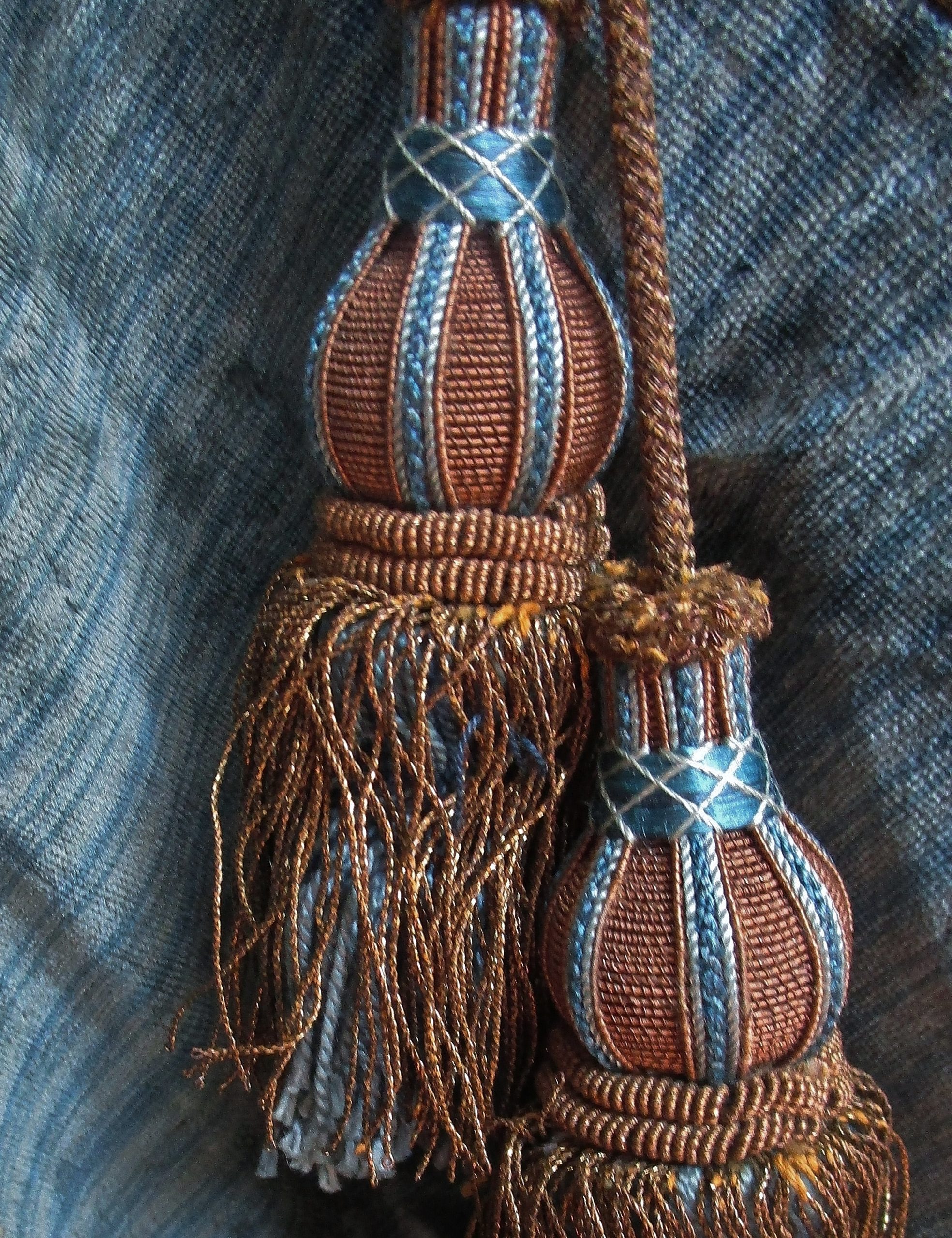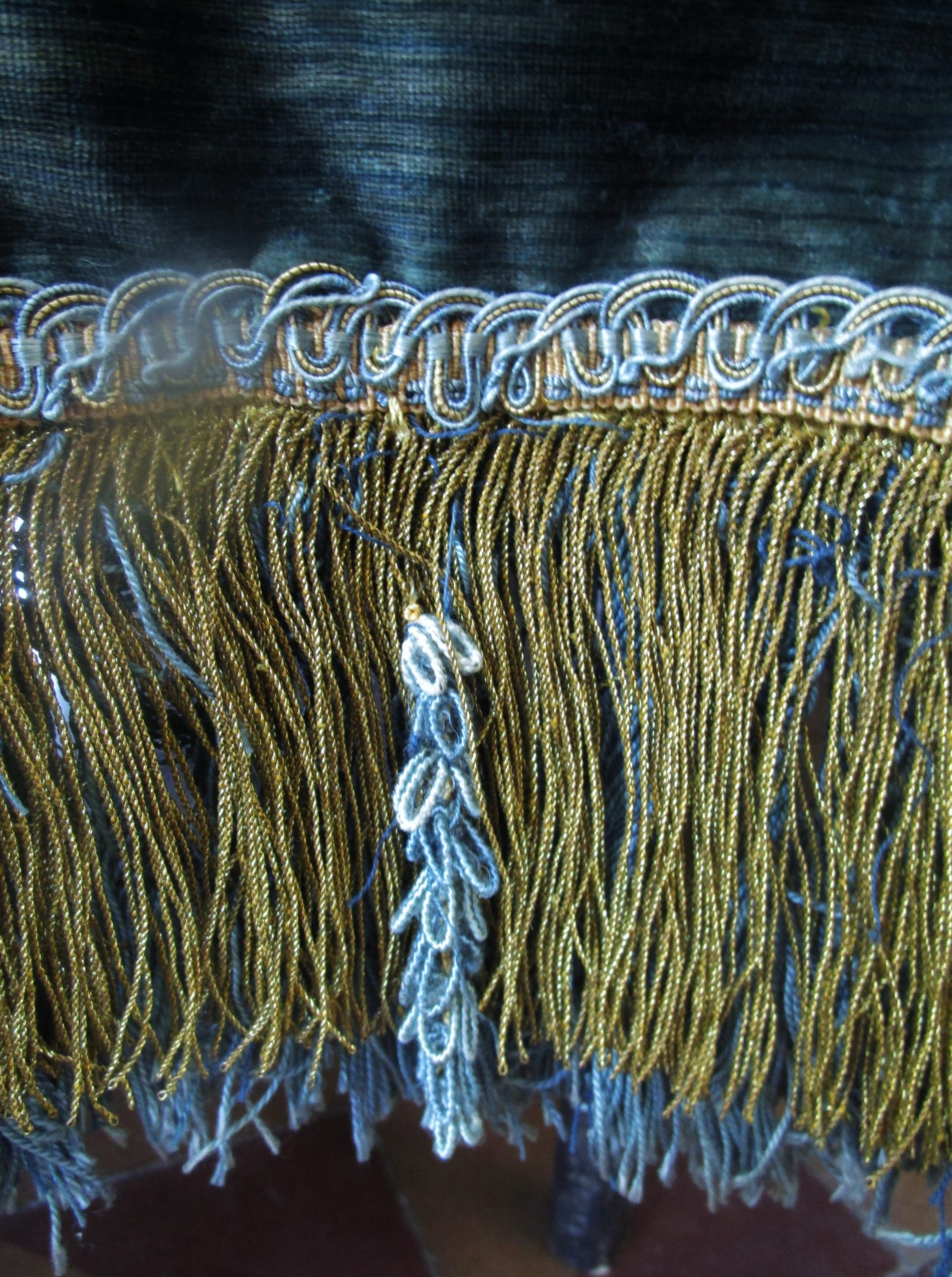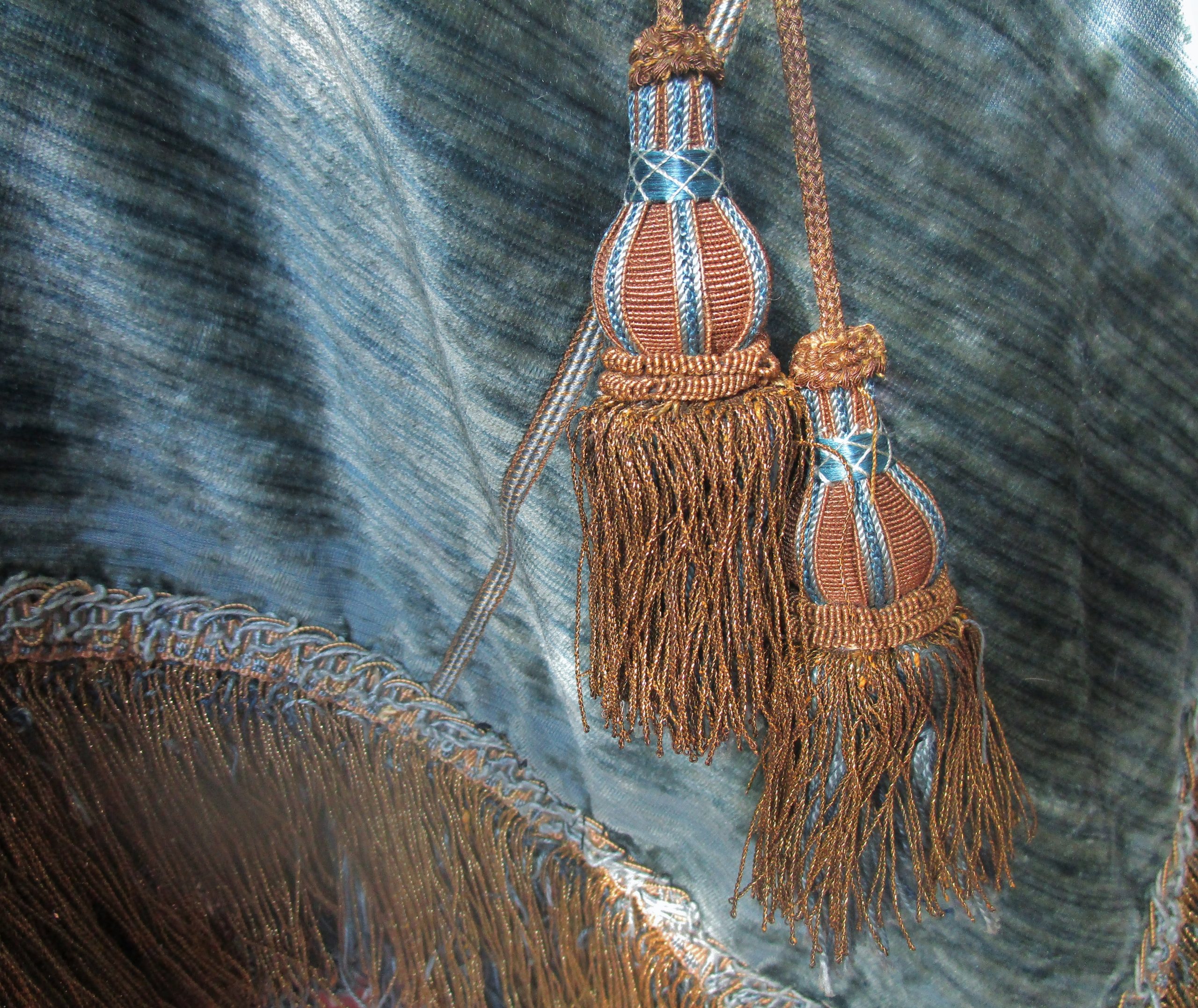 Rare et grande tenture en velours de soie bleu, doublé de bourrette de soie avec aux quatre coins deux énormes Passementeries ornées de Pompons bleus tressés de file métallique or –
