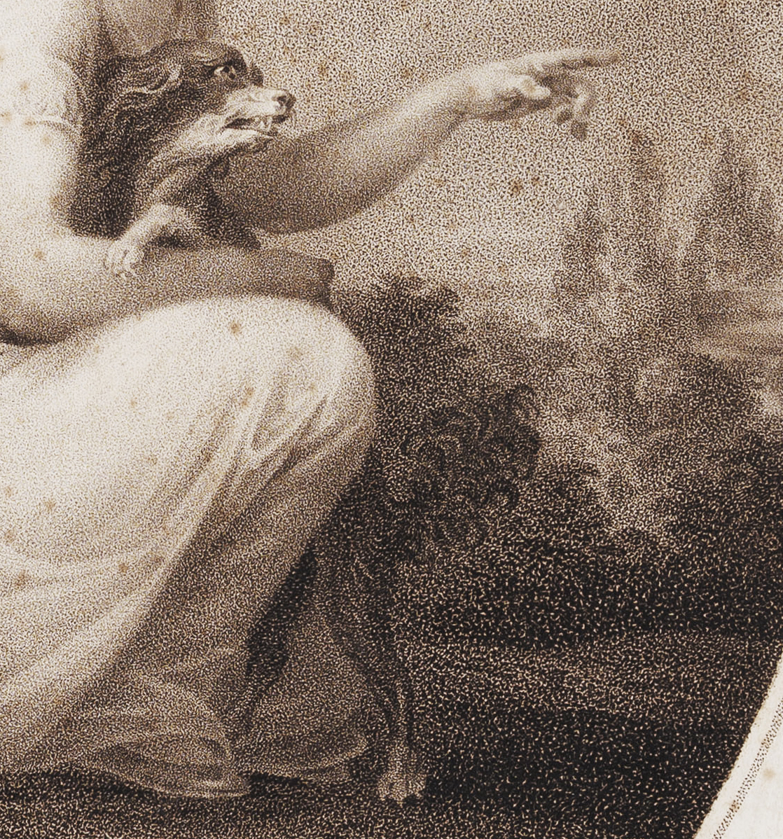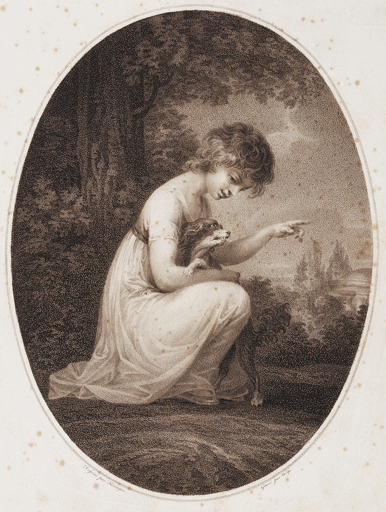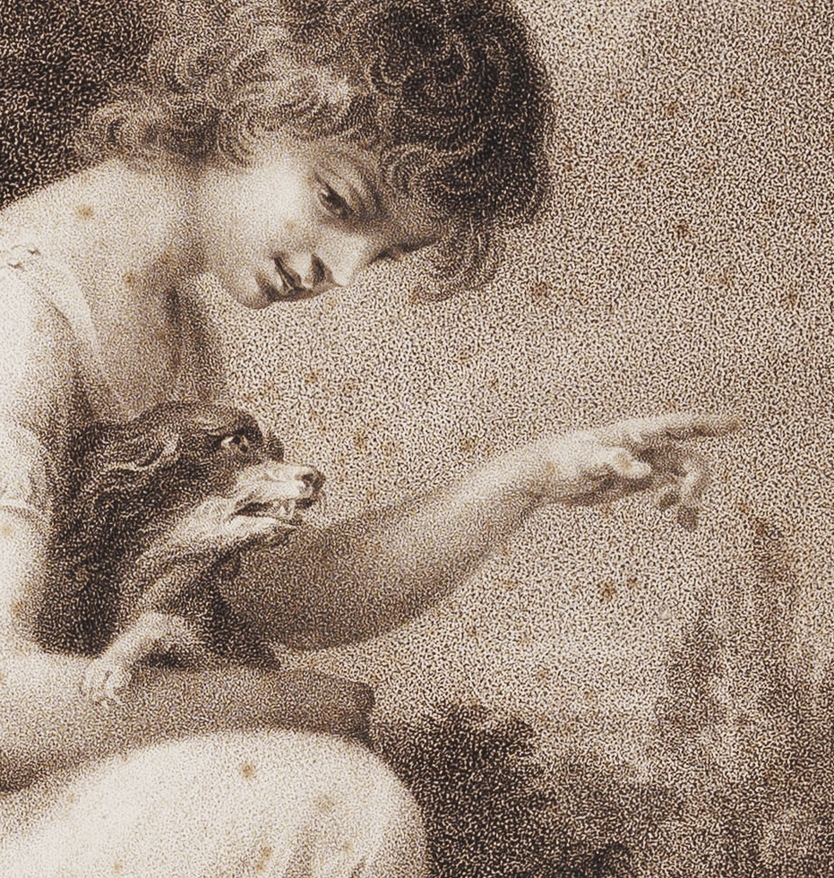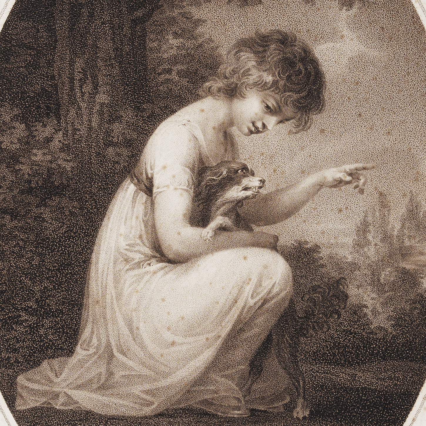 Cette gravure, imprimée à l’encre brune chaude à l’aide des techniques du pointillé et de la roulette, reflète l’émergence d’un langage graphique plus doux et pictural, caractéristique de la gravure vers 1800. L’intimité de la composition en ovale, la pose gracieuse de la jeune fille et le ton doucement anecdotique inscrivent cette image dans cette tradition visuelle.