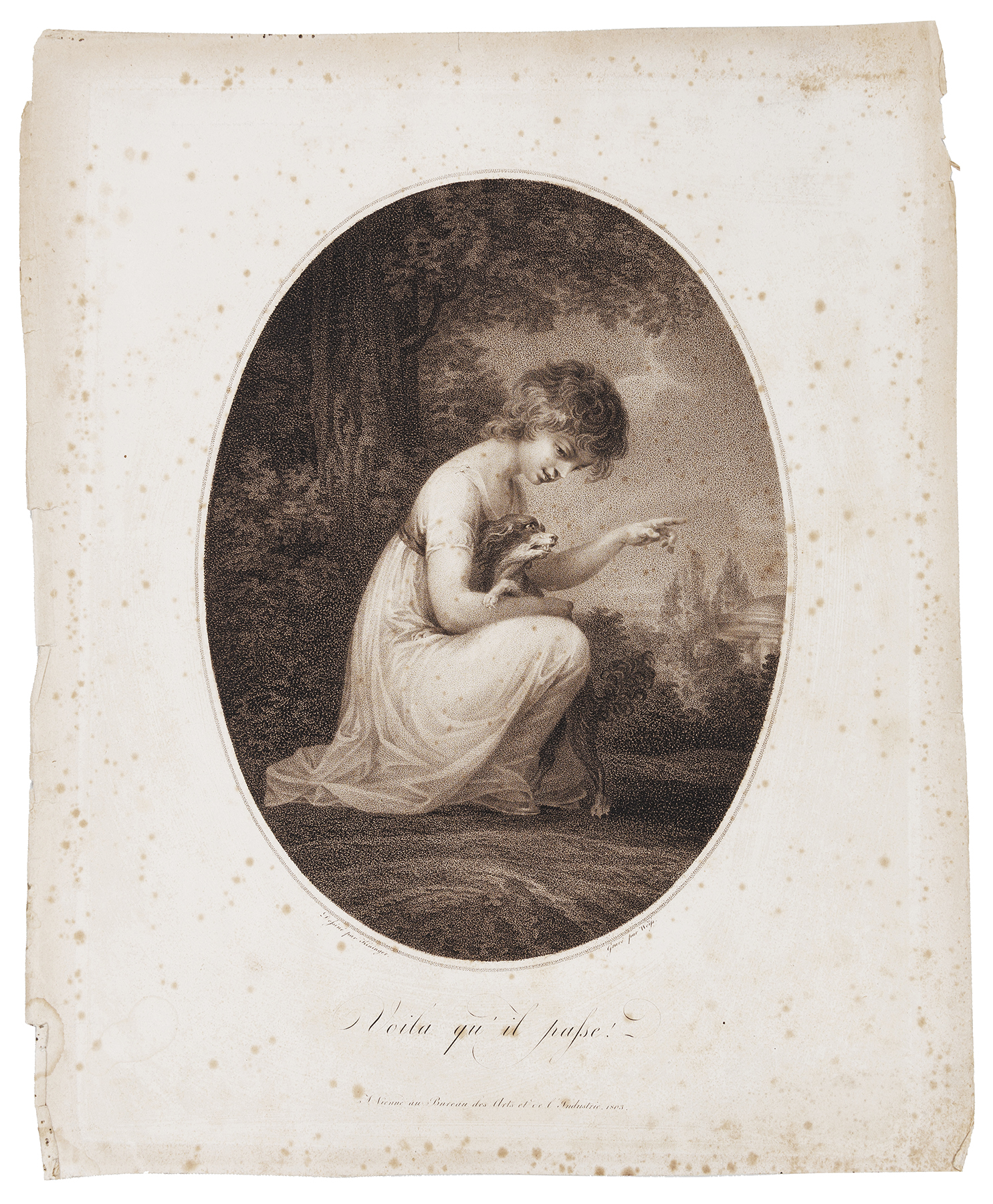 Gravure imprimée à l’encre brune, au pointillé et à la roulette, d’après un dessin de Kininger, gravée par Weiss. Signée « Voilà qu’il passe ! », « A Vienne aux Bureau des Arts et de l’Industrie, 1803 », « Dessinée par Kininger », « Gravé par Weiss ».